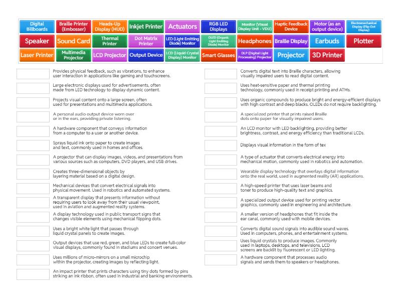 Output Device - A hardware component that conveys information from a computer to a user or another device., Monitor (Visual Display Unit - VDU) - Displays visual information in the form of tex, LCD (Liquid Crystal Display) Monitor - Uses liquid crystals to produce images. Commonly used in laptops, desktops, and televisions. LCD screens are backlit by fluorescent or LED lighting., LED (Light Emitting Diode) Monitor - An LCD monitor with LED backlighting, providing better brightness, contrast, and energy efficiency than traditional LCDs., OLED (Organic Light Emitting Diode) Monitor - Uses organic compounds to produce bright and energy-efficient displays with high contrast and deep blacks. OLEDs do not require backlighting., Projector - Projects visual content onto a large screen, often used for presentations and multimedia applications., DLP (Digital Light Processing) Projector - Uses millions of micro-mirrors on a small microchip within the projector, creating images by reflecting light., LCD Projector - Uses a bright white light that passes through liquid crystal panels to create images., Speaker - Converts digital sound signals into audible sound waves. Used in computers, phones, and entertainment systems., Headphones - A personal audio output device worn over or in the ears, providing private listening., Earbuds - A smaller version of headphones that fit inside the ear canal, commonly used with mobile devices., Sound Card - A hardware component that processes audio signals and sends them to speakers or headphones., Braille Display - Converts digital text into Braille characters, allowing visually impaired users to read digital content., Braille Printer (Embosser) - A specialized printer that prints raised Braille dots onto paper for visually impaired users., Haptic Feedback Device - Provides physical feedback, such as vibrations, to enhance user interaction in applications like gaming and touchscreens., Plotter - A specialized output device used for printing vector graphics, commonly used in engineering and architecture., 3D Printer - Creates three-dimensional objects by layering material based on a digital design., Actuators - Mechanical devices that convert electrical signals into physical movement. Used in robotics and automated systems., Motor (as an output device) - A type of actuator that converts electrical energy into mechanical motion, commonly used in robotics and automation., Smart Glasses - Wearable display technology that overlays digital information onto the real world, used in augmented reality (AR) applications., Heads-Up Display (HUD) - A transparent display that presents information without requiring users to look away from their usual viewpoint, used in aviation and augmented reality systems., Multimedia Projector - A projector that can display images, videos, and presentations from various sources such as computers, DVD players, and USB drives., Dot Matrix Printer - An impact printer that prints characters using tiny dots formed by pins striking an ink ribbon, often used in industrial and banking environments., Thermal Printer - Uses heat-sensitive paper and thermal printing technology, commonly used in receipt printing and ATMs., Laser Printer - A high-speed printer that uses laser beams and toner to produce high-quality text and graphics., Inkjet Printer - Sprays liquid ink onto paper to create images and text, commonly used in homes and offices., Electromechanical Display (Flip-Dot Display) - A display technology used in public transport signs that changes visible elements using mechanical flipping dots., Digital Billboards - Large electronic displays used for advertisements, often made from LED technology to display dynamic content., RGB LED Displays - Output devices that use red, green, and blue LEDs to create full-color visual displays, commonly found in stadiums and concert venues.,