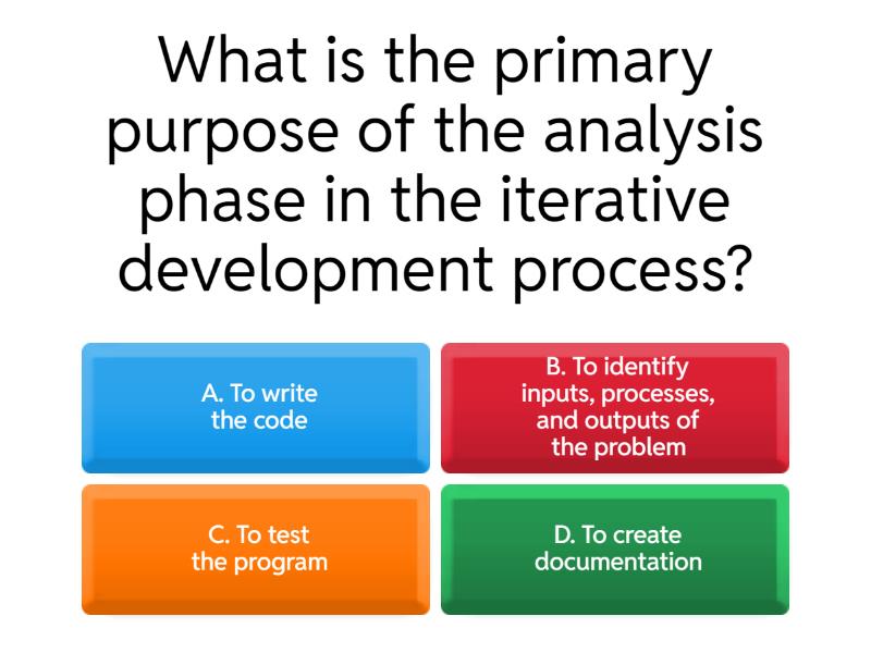 1) What is the primary purpose of the analysis phase in the iterative development process? a) A. To write the code b) B. To identify inputs, processes, and outputs of the problem c) C. To test the program d) D. To create documentation 2) Which of the following design tools is used to visually represent the flow of a program? a) A. Database diagram b) B. Pseudocode c) C. Flowchart d) D. Data dictionary 3) In user interface design, what is a wireframe used for? a) A. To show the program's logic b) B. To represent the layout of inputs and outputs c) C. To display the program's code d) D. To demonstrate data structures 4) Which data type would be most appropriate for storing a single letter? a) A. Boolean b) B. String c) C. Character d) D. Array 5) What is the purpose of a Boolean data type? a) A. To store text b) B. To store true/false values c) C. To store numbers d) D. To store multiple values 6) Which operator would you use to check if two values are NOT equal? a) A. == b) B. <= c) C. <> d) D. >= 7) What is a running total within a loop used for? a) A. Counting iterations b) B. Accumulating values during iteration c) C. Checking loop conditions d) D. Storing array indices 8) Which of these is an example of a complex conditional statement? a) A. x > 5 b) B. name == "John" c) C. age >= 18 AND score > 70 d) D. count < 10 9) What does the length predefined function return for an array? a) A. The largest value in the array b) B. The number of elements in the array c) C. The first element of the array d) D. The last element of the array 10) What type of error occurs when the program fails to execute due to incorrect syntax? a) A. Logic error b) B. Runtime / Execution error c) C. Syntax error d) D. Semantic error 11) What is input validation used for? a) A. To make the program run faster b) B. To ensure user inputs meet required criteria c) C. To create user interfaces d) D. To sort data 12) Which of these is an example of extreme test data? a) A. Normal expected values b) B. Values at the edge of acceptable range. c) C. Typical user input d) D. Standard numbers 13) What makes code more readable? a) A. Using single-letter variable names b) B. Removing all white space c) C. Meaningful identifier names d) D. Minimal commenting 14) What is the purpose of internal commentary in code? a) A. To make the code run faster b) B. To explain how the code works c) C. To create variables d) D. To declare functions 15) Which loop would you use when you know exactly how many iterations are needed? a) A. While loop b) B. Do-while loop c) C. For loop d) D. If statement 16) What does array traversal mean? a) A. Sorting the array b) B. Creating a new array c) C. Accessing each element of the array d) D. Deleting array elements 17) How is string concatenation performed? a) A. By adding strings together b) B. By dividing strings c) C. By comparing strings d) D. By sorting strings 18) What is the purpose of the random predefined function? a) A. To round numbers b) B. To generate random values c) C. To sort data d) D. To validate input 19) Which of these is an example of efficient use of coding constructs? a) A. Using loops in place of multiple lines of coding b) B. Using appropriate data types for variables c) C. Repeating code multiple times d) D. Using global variables extensively 20) What is pseudocode used for? a) A. To compile the program b) B. To write the final code c) C. To plan program logic in plain language d) D. To test the program