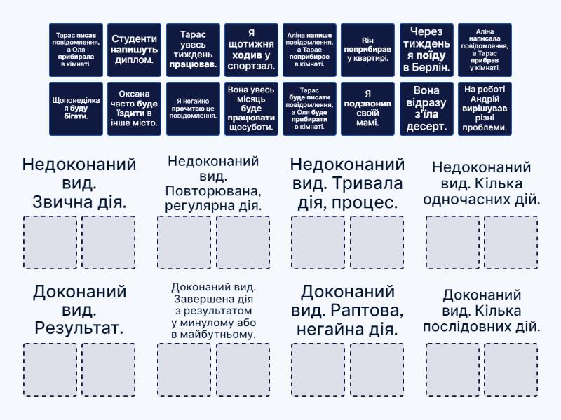 Недоконаний вид. Звична дія.: На роботі Андрій вирішував різні проблеми., Оксана часто буде їздити в інше місто., Недоконаний вид. Повторювана, регулярна дія.: Я щотижня ходив у спортзал., Щопонеділка я буду бігати., Недоконаний вид. Тривала дія, процес.: Тарас увесь тиждень працював., Вона увесь місяць буде працювати щосуботи., Недоконаний вид. Кілька одночасних дій.: Тарас писав повідомлення, а Оля прибирала в кімнаті., Тарас буде писати повідомлення, а Оля буде прибирати в кімнаті., Доконаний вид. Результат.: Я подзвонив своїй мамі., Через тиждень я поїду в Берлін., Доконаний вид. Завершена дія з результатом у минулому або в майбутньому.: Студенти напишуть диплом., Він поприбирав у квартирі., Доконаний вид. Раптова, негайна дія.: Вона відразу з'їла десерт., Я негайно прочитаю це повідомлення., Доконаний вид. Кілька послідовних дій.: Аліна написала повідомлення, а Тарас прибрав у кімнаті., Аліна напише повідомлення, а Тарас поприбирає в кімнаті.,