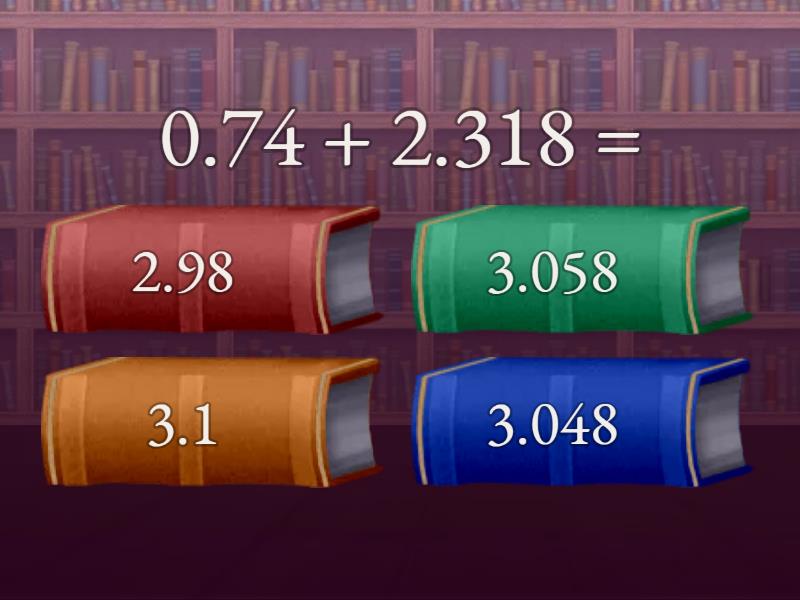 1) 0.74 + 2.318 = a) 2.98 b) 3.058 c) 3.1 d) 3.048 2) 1.256 + 3.47 = a) 4.756 b) 5.146 c) 4.726 d) 4.716 3) 5.83 + 0.947 = a) 6.87 b) 6.593 c) 7.83 d) 6.777 4) 9.12 + 4.308 = a) 12.428 b) 14.128 c) 13.428 d) 13.218 5) 6.235 + 2.78 + 4.05 = a) 12.675 b) 13.065 c) 13.485 d) 13.185 6) 3.42 + 8.907 + X = 15.43,求 X。 a) 3.103 b) 2.993 c) 4.503 d) 3.303 7) 7.3 + 4.1 + 2.569 = a) 12.789 b) 14.569 c) 13.989 d) 13.969 8) 10.42 + 6.13 + 2.627 = a) 19.177 b) 17.57 c) 19.57 d) 18.627 9) 3.52 + 2.478 + 7.64 = a) 13.638 b) 14.092 c) 12.852 d) 13.632 10) 4.52 - 1.307 = a) 3.173 b) 3.213 c) 3.217 d) 3.513 11) 9.82 - 3.45 = a) 6.42 b) 6.45 c) 6.27 d) 6.37 12) 12.5 - 4.207 = a) 8.347 b) 8.223 c) 8.213 d) 8.293 13) 8.72 - 2.618 = a) 6.132 b) 6.172 c) 6.102 d) 6.121 14) X - 3.806 = 9.125,求 X。 a) 12.931 b) 12.815 c) 12.125 d) 12.725 15) 15.32 - 7.46 - 2.35 =  a) 5.65 b) 5.78 c) 5.51 d) 5.41 16) 21.96 - 9.728 = a) 12.527 b) 12.232 c) 12.187 d) 12.082 17) 10.53 - 2.615 - 4.12 = a) 3.795 b) 3.885 c) 3.695 d) 3.995 18) 5.46 - M = 2.918,求 M a) 2.942 b) 2.542 c) 2.872 d) 3.542 19) 13.75 - 6.12 - 4.208 = a) 3.422 b) 3.082 c) 3.428 d) 3.652