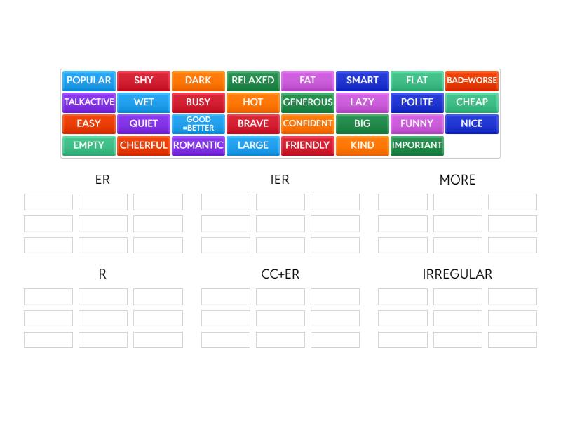 ER: CHEAP, QUIET, SMART, KIND, DARK, SHY, IER: FUNNY, EASY, LAZY, EMPTY, FRIENDLY, BUSY, MORE: POPULAR, CHEERFUL, TALKACTIVE, GENEROUS, CONFIDENT, POLITE, IMPORTANT, RELAXED, ROMANTIC, R: NICE, BRAVE, LARGE, CC+ER: BIG, HOT, WET, FLAT, FAT, IRREGULAR: GOOD =BETTER, BAD=WORSE,