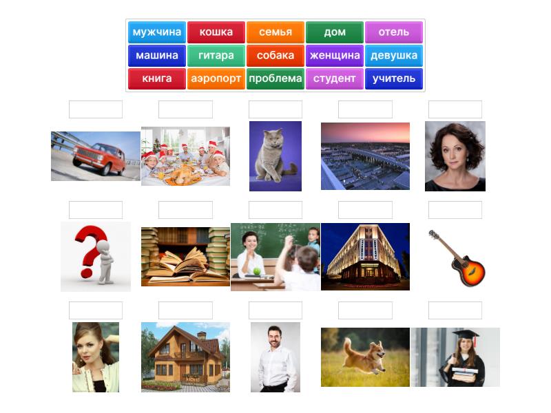 аэропорт , дом , гитара, книга, кошка , машина, мужчина, женщина, девушка, учитель, отель, семья, собака, студент, проблема,