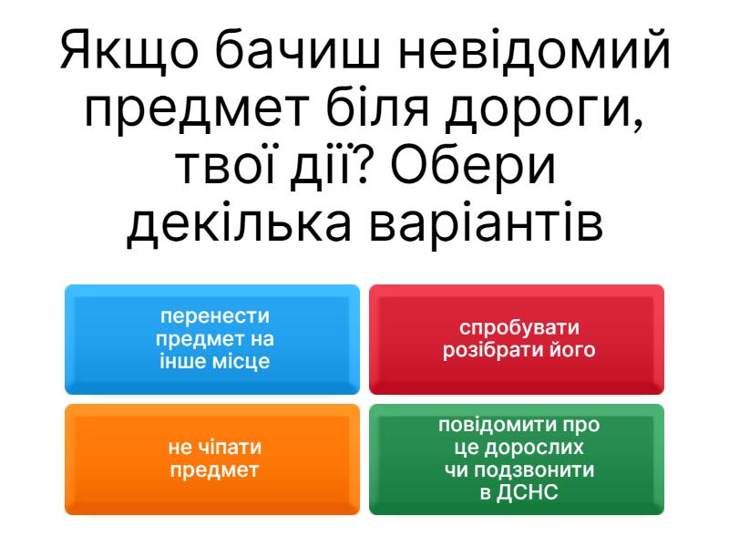 1) Якщо бачиш невідомий предмет біля дороги, твої дії? Обери декілька варіантів a) перенести предмет на інше місце b) спробувати розібрати його c) не чіпати предмет d) повідомити про це дорослих чи подзвонити в ДСНС 2) Ти на вулиці і чуєш повітряну тривогу, твої дії? a) далі йду по справах b) починаю знімати відео та роблю фото c) шукаю найближче укриття, щоб сховатись 3) Якщо ти вдома і чуєш постріли, твої дії? a) сховатись якнайдалі від вікон, в безпечне місце b) зробити фото і скинути друзям c) підійти до вікна і подивитись, що трапилось 4) Правильні дії під час прогулянки: a) Не торкайся невідомих предметів, навіть схожих на іграшки чи пакунки b) Гуляти можна в будь-яких місцях, не дивлячись під ноги c) Якщо знайшов щось незвичне, зупинись, відійди подалі тим шляхом, що прийшов 5) Я знаходжуся вдома та чую сигнал повітряної тривоги, які мої дії? a) Я вимикаю комп'ютер та без паніки, але швидко беру речі та прямую до укриття b) Я нічого не роблю, повітряні тривоги лунають часто, але нічого страшного не відбувається c) Якщо можливості спуститися до укриття немає, то дотримуюся правила двох стін 6) Що ти знаєш про комендантську годину? Обери декілька варіантів a) це придумали дорослі, аби ми довго не гуляли b) в цей час не можна перебувати на вулиці c) це є загальнообов’язковим правилом для всіх d) Національна Поліція може затримати людину, яка перебуває в комендантський час на вулиці e) це правило лише для дітей та підлітків 7) При виявленні незнайомих (вибухонебезпечних) предметів забороняється: a) встановлювати біля них якусь позначку (гілкою, пакетом, обгородити яскравою стрічкою, тощо) b) намагатися розбирати, пересувати , ударяти, нагрівати їх c) кидати в річку/водойму, закопувати в землю 8) Що мені потрібно мати із собою? a) Тривожний рюкзак із необхідними речами (вода, ліки, їжа) b) Заряджений телефон c) Записку з іменами та телефонами батьків d) Нічого особливого