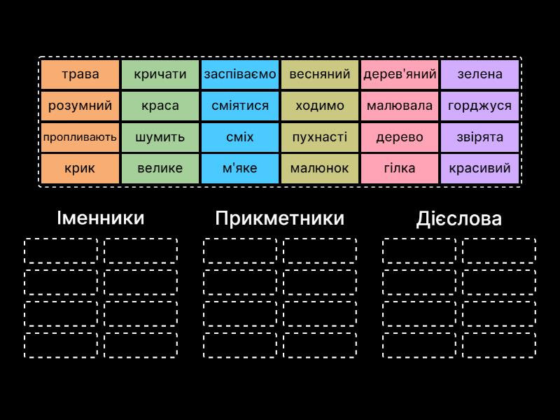 Іменники: краса, звірята, гілка, малюнок, сміх, крик, трава, дерево, Прикметники: дерев'яний, красивий, весняний, зелена, велике, розумний, пухнасті, м'яке, Дієслова: сміятися, кричати, малювала, ходимо, заспіваємо, горджуся, пропливають, шумить,