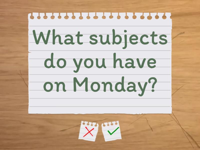 What’s your favorite subject? Why? - My favorite subject is English because it’s fun., What subjects do you have on Monday? - On Monday I have Math, Science and PE., What time do you start school? - School starts at 8:30., What do you usually do during break time? - During break time, I usually talk with friends / eat a snack / play outside., Tell me about your teacher. Is he/she nice? - My teacher is kind and funny / strict but good.,