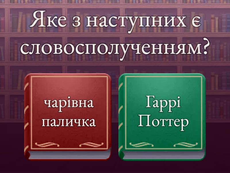 1) Яке з наступних є словосполученням? a) чарівна паличка b) Гаррі Поттер 2) Яке з наступних не є словосполученням? a) чарівний капелюх b) Гоґвортс 3) Виберіть словосполучення. a) літаюча мітла b) Снейп 4) Що не є словосполученням? a) чарівний зілляр b) Дамблдор та Гаррі 5) Яке з наступних є словосполученням? a) магічний світ b) Герміона і Рон 6) Яке з наступних не є словосполученням? a) чарівний замок b) Рон побіг 7) Виберіть словосполучення. a) чарівний факультет b) Грифіндор навчає 8) Що не є словосполученням? a) магічний урок b) Гоґсмід 9) Яке з наступних є словосполученням? a) чарівний предмет b) Волдеморт розлютився 10) Яке з наступних не є словосполученням? a) магічний камінь b) Гаррі замислився 11) Виберіть словосполучення. a) чарівний урок b) Сіріус 12) Що не є словосполученням? a) магічний зілляр b) Гоґвортс