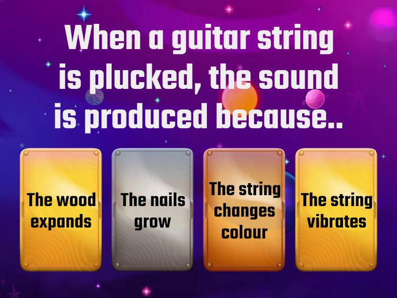 1) When a guitar string is plucked, the sound is produced because.. a) The wood expands b) The nails grow c) The string changes colour d) The string vibrates  2) In a tuning fork, sound is produced when the prongs.. a) Bend permanently b) Vibrate back and forth c) Stay completely still d) Change colour 3) Which of the following correctly describes how sound travels after being produced? a) Vibrations move through a medium as waves  b) Vibrations turn into light c) Vibrations disappear instantly d) Vibrations only occur in vacuum 4) In human speech, the sound is produced mainly by the.. a) Teeth b) Vocal cords c) Tongue d) Lungs 5) The vibration of a loudspeaker diaphragm produces sound by.. a) Directly moving air molecules b) Producing light flashes c) Heating the air d) Generating magnetic fields only 6) Which of the following is NOT a vibrating object that can produce sound.. a) Tuning fork b) Guitar string c) Light bulb d) Drum skin 7) The sound of thunder is produced when.. a) Clouds vibrate b) Air vibrates due to rapid expansion c) Light bounces in the sky d) D. Water evaporates quickly 8) Which statement about sound production is correct? a) All sounds are made by vibrating objects b) Only musical instruments can make sound c) Vibrations only occur in air d) Sound can be produced in a perfect vacuum 9) Which of the following correctly matches instrument and vibrating part? a) Bell – vibrating clapper only b) Flute – vibrating metal keys c) Drum – vibrating wooden shell d) Piano – vibrating string 10) When a door slams shut, the sound you hear is mainly caused by: a) Light reflection b) Expansion of wood c) Heat generation d) Vibration of the door and air