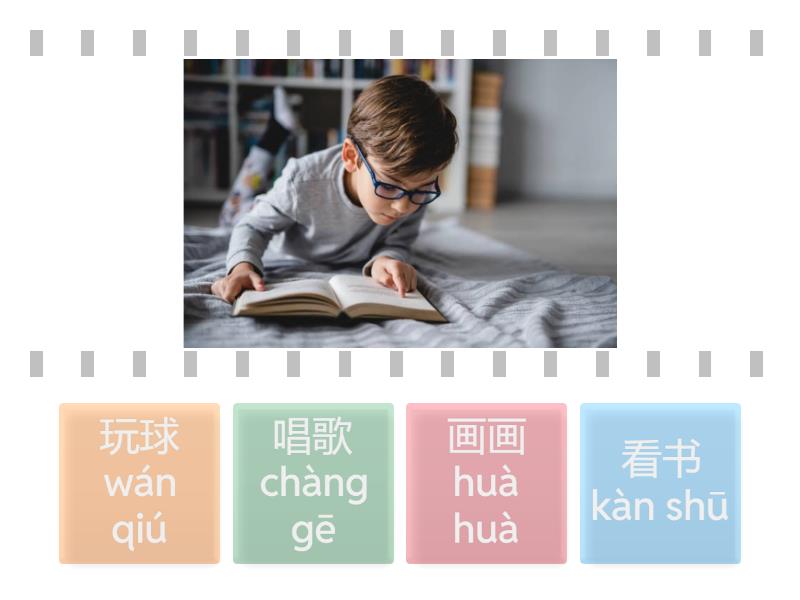 看书 kàn shū, 画画 huà huà, 玩球 wán qiú, 唱歌 chàng gē,