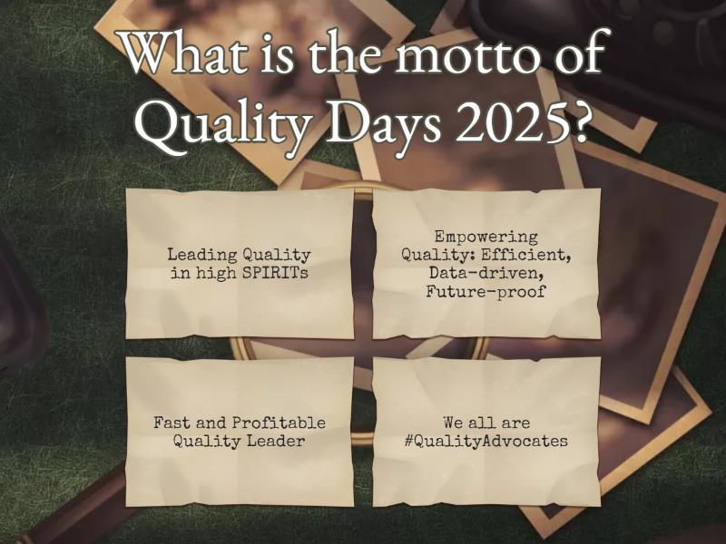 1) What is the motto of Quality Days 2025? a) Leading Quality in high SPIRITs b) Empowering Quality: Efficient, Data-driven, Future-proof c) Fast and Profitable Quality Leader d) We all are #QualityAdvocates 2) What is the slogan of Quality days? a) Leading Quality in high SPIRITs b) Empowering Quality: Efficient, Data-driven, Future-proof c) Fast and Profitable Quality Leader d) We all are #QualityAdvocates 3) Which of the following is NOT our Quality Policy? a) Improve Productivity and focus on Profitable Growth in Operations. b) We differentiate as quality leader. c) Quality means to us: zero defect regarding our commitments. 4) I always follow our ______. a) Planning b) Own mind c) Procedures d) Decision 5) In Quality Policy, We differenciate as Quality ______. a) Director b) Leader c) Engineer d) Planner 6) I am sensitive to (a)_____________ & handle them (b)_____________. a) (a) deviations (b) continuously b) (a) deviations (b) constructively c) (a) documentation (b) continuously d) (a) documentation (b) constructively 7) Our Quality Mission is to produce with zero (a)______ and without (b)______. a) (a) deviations (b) issues b) (a) defects (b) problems c) (a) abort (b) complaints d) (a) excursions (b) spills 8) All Infineon employees act as quality advocates in their areas of responsibility. a) A. True b) B. False 9) We follow our _________. a) Quality leader b) Quality head c) Quality buddy d) Quality principles 10) Which one is Green Line logo? a) b) c) d) 11) Why daily 5S is so important? a) My manager is watching everyday. b) To detect any abnormality and find root cause of the problem. c) Force people to clean everything. 12) Why 5S is NOT a one time job? a) It won't be perfect in an instant and everything can be improved. b) Because one day cannot clean everything. c) No quick fix, so need to clean everyday. 13) In Green Line, what is QRA stand for? a) Quality Responsibility All b) Quality Response Action c) Quick Response Action d) Quick Response Activity 14) Which action is a GOOD practice. a) Always follow given procedure and quality principle. b) Can take a short nap inside fab during working hours. c) Can eat inside fab anytime. 15) What is the meaning of YIP? a) Your Interest Pays b) Your Idea Pays c) Your Mind Pays d) Your Heart Pays 16) Which one is NOT a benefit of YIP activity? a) Protect environment b) Product quality c) Cost incured d) Savings 17) Which of the following action is a BAD practice? a) Always follow given procedure and quality principle. b) Can take a short nap inside fab during working hours. c) We are not allowed to eat inside fab. 18) Vendor and visitor can submit YIP. a) A. True b) B. False 19) Select GOOD practices. (multiple answers) a) Carry lot with two hands. b) Put wafer box on box holder properly. c) Hold the side of cassette and place on loading stage. d) Can take a short nap inside fab during working hours.