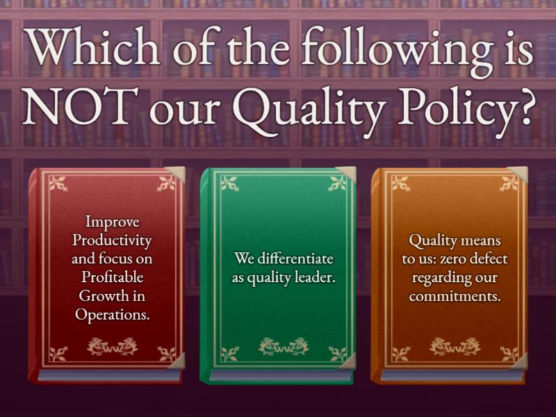 1) Which of the following is NOT our Quality Policy? a) Improve Productivity and focus on Profitable Growth in Operations. b) We differentiate as quality leader. c) Quality means to us: zero defect regarding our commitments. 2) I am sensitive to (a)_____________ & handle them (b)_____________ a) (a) deviations (b) continuously b) (a) deviations (b) constructively c) (a) documentation (b) continuously d) (a) documentation (b) constructively 3) What is the motto of Quality Days 2025? a) Leading Quality in high SPIRITs b) Empowering Quality: Efficient, Data-driven, Future-proof c) Fast and Profitable Quality Leader d) We all are #QualityAdvocates 4) What is the slogan of Quality days? a) Leading Quality in high SPIRITs b) Empowering Quality: Efficient, Data-driven, Future-proof c) Fast and Profitable Quality Leader d) We all are #QualityAdvocates 5) In our Quality Policy, we differentiate ourselves as Quality  a) Director  b) Leader c) Engineer d) Planner 6) Our Quality Mission is to produce with zero (a)______ and without (b)______ a) (a) deviations (b) issues b) (a) defects (b) problems c) (a) abort (b) complaints d) (a) excursions (b) spills 7) SPIRIT consists of a) Ambition, Responsibility, Decision b) Ambition, Responsiveness, Decision c) Ambition, Respect, Direction d) Ambition, Respect, Decision 8) Why 5S is NOT a one time job? a) It won't be perfect in an instant and everything can be improved.  b) Because one day cannot clean everything. c) No quick fix, so need to clean everyday. 9) All Infineon employees act as quality advocates in their areas of responsibility. a) A. True b) B. False 10) I always follow our a) Planning b) Own mind c) Procedures d) Decision 11) Which action is a GOOD practice a) Always follow given procedure and quality principle. b) Can take a short nap inside fab during working hours. c) Can eat inside fab anytime. 12) Which of the following action is a BAD practice? a) Always follow given procedure and quality principle. b) Can take a short nap inside fab during working hours. c) Sit on tool, pillar and workstation d) We are not allowed to eat inside fab. 13) We follow our a) Quality leader  b) Quality head c) Quality buddy d) Quality principles 14) Which one is Green Line logo? a) b) c) d) 15) Why daily 5S is so important? a) My manager is watching everyday. b) To detect any abnormality and find root cause of the problem. c) Force people to clean everything. 16) In Green Line, what is QRA stand for? a) Quality Responsibility All b) Quality Response Action c) Quick Response Action d) Quick Response Activity 17) What is the meaning of YIP? a) Your Interest Pay b) Your Idea Pay c) Your Mind Pay d) Your Heart Pay 18) Vendor and visitor can submit YIP. a) A. True b) B. False 19) Select GOOD practices. (multiple answers) a) Carry lot with two hands. b) Put wafer box on box holder properly. c) Hold the side of cassette and place on loading stage. d) Can eat inside fab anytime. 20) Which one is NOT a benefit of YIP activity? a) Protect environment b) Product quality c) Cost incured d) Savings