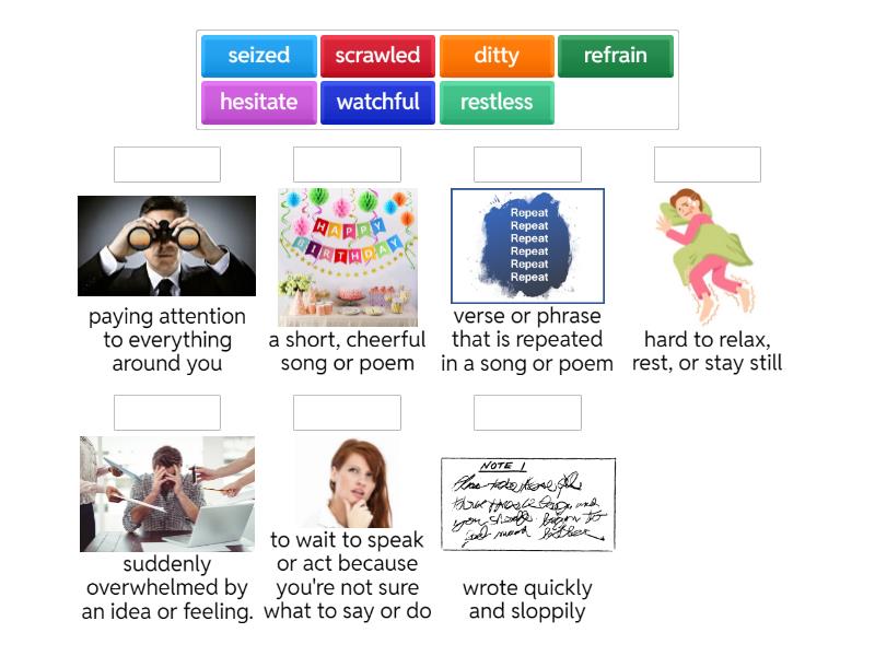 seized - suddenly overwhelmed by an idea or feeling. , scrawled - wrote quickly and sloppily, restless - hard to relax, rest, or stay still, hesitate - to wait to speak or act because you're not sure what to say or do, ditty - a short, cheerful song or poem, watchful - paying attention to everything around you , refrain - verse or phrase that is repeated in a song or poem,