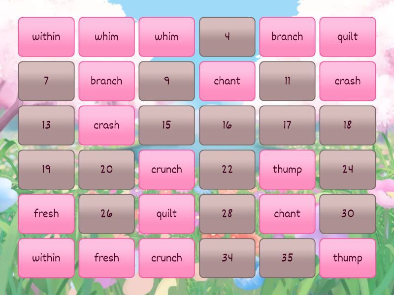 quilt, chant, fresh, crunch, thump, whim, branch, within, crash, catfish, shred, publish, bathtub, hunch, splash, blushing, inching, lunchbox,