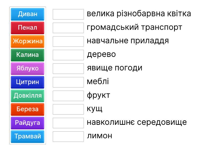 Трамвай - громадський транспорт, Яблуко - фрукт, Райдуга - явище погоди, Пенал - навчальне приладдя, Жоржина - велика різнобарвна квітка, Довкілля - навколишнє середовище, Диван - меблі, Береза - дерево, Цитрин - лимон, Калина - кущ,