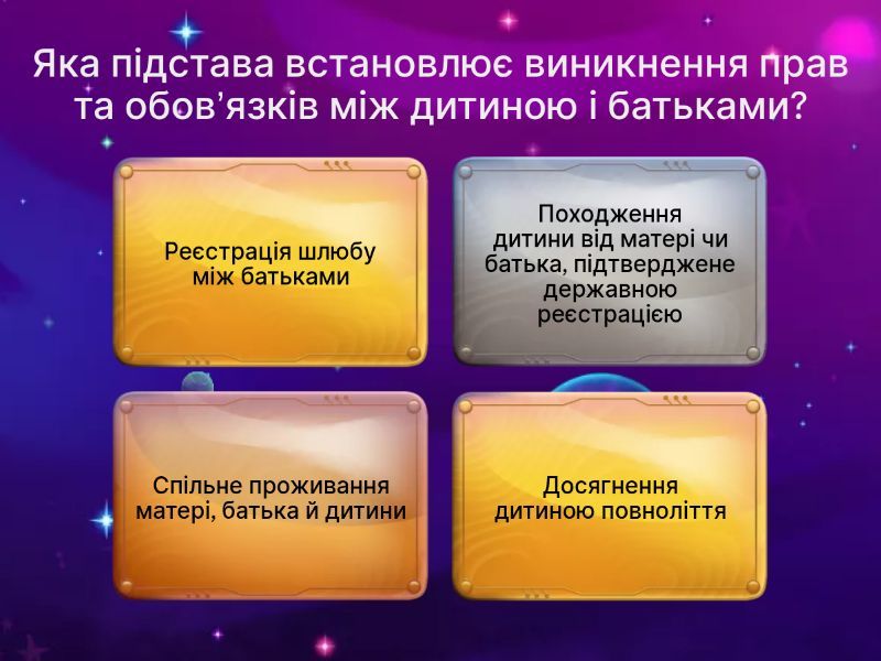 1) Яка підстава встановлює виникнення прав та обов’язків між дитиною і батьками? a) Реєстрація шлюбу між батьками b) Походження дитини від матері чи батька, підтверджене державною реєстрацією c) Спільне проживання матері, батька й дитини d) Досягнення дитиною повноліття 2) У яких обставинах дитина вважається такою, що походить від подружжя? a) Якщо народжена після розлучення b) Якщо мати-одиначка подає заяву c) Якщо народжена у шлюбі або до 10 місяців після припинення шлюбу d) Якщо батько особисто визнає батьківство 3) У випадку народження дитини в результаті застосування допоміжних репродуктивних технологій, яке правило діє? a) Материнство не може бути оскаржене b) Подружжя автоматично визнаються батьками c) Особливий порядок встановлення походження дитини d) Походження визначається лише за рішенням суду 4) Якщо мати повторно вийшла заміж, а дитина народилась від попереднього чоловіка, який порядок? a) Походження дитини від батька за повторним шлюбом визначається окремо b) Походження дитини від нового чоловіка c) Мати автоматично визнає нового чоловіка батьком d) Запис про батька не робиться 5) Коли батьки не перебувають у шлюбі, як визначається походження дитини від батька? a) Тільки якщо батько просить b) Автоматично після народження c) Лише за заявою матері d) За рішенням суду або за спільною заявою матері і батька 6) Який механізм передбачено для встановлення походження дитини від батька, коли батьки не перебувають у шлюбі? a) Заперечення матері b) Заява матері та батька до органу державної реєстрації c) Автоматичне визнання після досягнення дитиною 18 років d) Лише рішенням суду 7) Як може бути встановлено батьківство за рішенням суду? a) За спільною заявою батьків b) За довільним рішенням c) За заявою матері чи дитини d) За рішенням нотаріуса 8) Який спір може виникнути між чоловіком матері дитини та особою, яка вважає себе батьком? a) Про визнання батьківства b) Про переїзд дитини c) Про обов’язок сплачувати аліменти d) Про зміни імені дитини 9) У яких випадках можливе встановлення факту батьківства за рішенням суду? a) Лише якщо батько відмовляється b) Якщо дитина досягла повноліття c) У разі смерті чоловіка, який не перебував у шлюбі з матір'ю дитини d) У разі розлучення 10) Хто може оспорювати батьківство особи, записаної батьком дитини? a) Лише сама особа b) Сам чоловік, записаний батьком c) Мати дитини чи дитина d) Лише орган опіки 11) Яка ситуація регулюється правом жінки звернутися до суду — згідно із гла­вою 12? a) Спір про материнство — коли жінка записана матір’ю, але не є реальною матір’ю, або навпаки b) Позов матері про встановлення батьківства c) Позов про зміну прізвища дитини d) Позов про стягнення аліментів 12) Яке право має мати дитини щодо оспорювання батьківства свого чоловіка? a) Позов про зміну опіки b) Позов про зміну прізвища дитини c) Позов про виключення запису про нього як батька дитини з актового запису про народження дитини d) Позов про стягнення аліментів 13) Чи є стягнення аліментів з особи, записаної батьком або матір’ю, перешкодою для звернення до суду з вимогою виключення її як батька/матері? a) Так є перешкодою b) Ні — не є перешкодою c) Так — якщо аліменти стягуються понад 5 років d) Так — якщо особа визнає батьківство добровільно