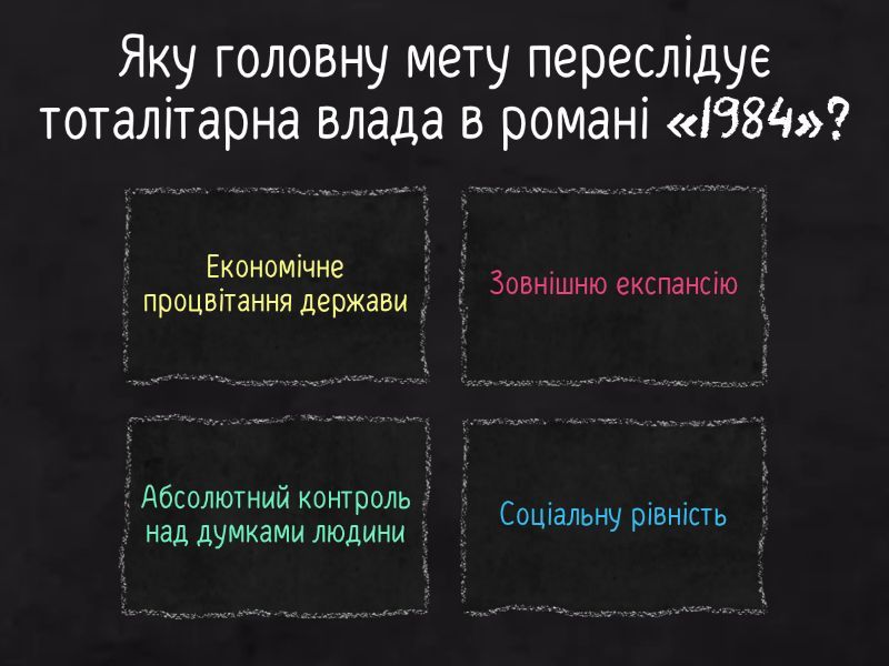 1) Яку головну мету переслідує тоталітарна влада в романі «1984»? a) Економічне процвітання держави b) Зовнішню експансію c) Абсолютний контроль над думками людини d) Соціальну рівність 2) Чому Партія постійно змінює минуле? a) Через технічні помилки b) Щоб заплутати ворогів c) Для знищення історичних джерел d) Щоб позбавити людину опори для критичного мислення 3) Яке значення має гасло «Свобода — це рабство»? a) Заклик до праці b) Релігійний символ c) Інструмент логічного поневолення свідомості d) Закодоване повідомлення Опору 4) Яку роль виконує Страх у системі влади Океанії? a) Тимчасовий метод впливу b) Засіб виховання дітей c) Форма самозахисту d) Основний механізм керування суспільством 5) Чому мова «новомова» є небезпечною для людини? a) Вона складна для вивчення b) Вона замінює англійську c) Вона обмежує здатність мислити й формулювати протест d) Вона призначена лише для чиновників 6) Яку функцію виконує Великий Брат? a) Реального політичного лідера b) Історичної постаті c) Символ постійного нагляду та страху d) Голови Опору 7) Чому Партія дозволяє існування «Опору»? a) Вона не може його знищити b) Це помилка влади c) Щоб виявляти та знищувати інакодумців d) Для ілюзії демократії 8) Який етап боротьби Вінстона є вирішальним? a) Запис думок у щоденник b) Любовні стосунки з Джулією c) Контакт з О’Браєном d) Злам його внутрішньої свідомості 9) Що означає формула «2 + 2 = 5» у романі? a) Математичну помилку b) Політичний жарт c) Перемогу влади над логікою та розумом людини d) Пропагандистський лозунг 10) Який соціальний прошарок потенційно здатний змінити систему? a) Внутрішня партія b) Зовнішня партія c) Поліція думок d) Проли 11) Чому любов у тоталітарному суспільстві є небезпечною? a) Вона заборонена законом b) Вона заважає роботі c) Вона формує особисті почуття та незалежне мислення d) Вона суперечить моралі 12) Який головний висновок робить роман «1984»? a) Людина завжди переможе систему b) Технології небезпечні c) Страх і покірність можуть знищити особистість d) Влада недовговічна