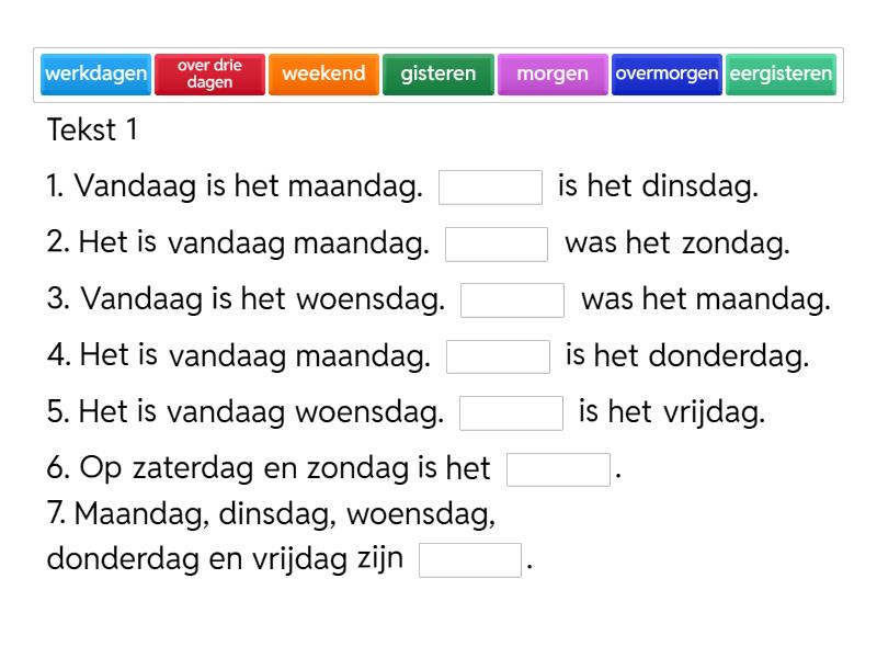 Tekst 1 1. Vandaag is het maandag. ____ is het dinsdag. 2. Het is vandaag maandag. ____ was het zondag. 3. Vandaag is het woensdag. ____ was het maandag. 4. Het is vandaag maandag. ____ is het donderdag. 5. Het is vandaag woensdag. ____ is het vrijdag. 6. Op zaterdag en zondag is het ____. 7. Maandag, dinsdag, woensdag, donderdag en vrijdag zijn ____. Tekst 2 1. Het is nu 15.00 uur. Het is ____. 2. Ik ga elke ____ om 23.00 uur slapen. 3. Van 12.00 tot 13.00 uur heet ____. 4. Om 00.00 uur begint de ____. 5. Om 24.00 of 00.00 uur precies is het ____. 6. Een ander woord voor de ochtend is de ____. 7. Ik drink elke ____ om 10.00 uur een kopje koffie. Tekst 3 1. De les begint ____ 9.00 's ochtends. 2. Wij hebben les ____ maandag en woensdag. 3. Ik ga ____ het weekend sporten. 4. Ik lunch ____ de middag. Ik eet brood ____ kaas en een kop soep. 5. De winkel is elke dag open ____ 9.00 tot 18.00 uur. 6. De winkel is open van maandag ____ zaterdag. Op zondag is de winkel gesloten. 7. De winkel is open van maandag ____ zondag. Op zondag is de winkel gesloten. Tekst 4 1. ____ woensdag heb ik geen tijd. Kunnen we ook een dag later afspreken? 2. Ik heb les ____ 9.00 tot 12.00 uur. 3. Ik werk ____ de week. In het weekend ben ik lekker vrij. 4. Middernacht, precies ____ 12 uur, begint het nieuwe jaar. 5. Deze winkel is van maandag ____ zaterdag geopend. Op zondag is de winkel dicht 6. Maar die andere winkel is van maandag ____ zaterdag geopend. Die winkel is op zaterdag èn zondag dicht. 7. Je moet ____ maandag je opdracht inleveren. De docent wil de opdrachten dus op zondag hebben. Als je de opdracht ____ zondag inlevert ben je dus te laat. 8. ____ het jaar 2007 werd mijn zoon geboren. 9. Deze wijn is ____ het jaar 2018. Tekst 5 1. Een ander woord voor 'ochtend' is ____. 2. 'Morgen' betekent ook: ____. 3. 's Morgens' betekent: ____. 4. Tussen 9.00 en 12.00 uur in ____ maak ik het huis schoon. 5. Het is nu 9.00 uur: het is ____. 6. Ik ga in ____, rond 15.00 uur, altijd even half uurtje slapen. 7. Het is nu 14.00 uur: het is ____. Tekst 6 1. 's ochtends - ____; 's middags - ____; 's avonds - ____; 's nachts - ____ 2. de morgen - ____ 3. morgen (!) - ____ 4. De lunchtijd, van 12.00-13.00 uur heet - ____ 5. Om 12.00 of 24.00 uur begint de nacht. Precies om 0.00 uur is het ____. 6. 'Afgelopen week' is het zelfde als ____. 7. 'Komende maandag' is hetzelfde als ____. 8. Zet in de goede volgorde: vandaag - morgen - ____ - ____ 9. Zet in de goede volgorde: vandaag - gisteren - ____ - ____. 10. Zet in de goede volgorde: vandaag, ____, ____, ____ en vannacht. Tekst 7 1. Mijn dochter is vandaag twee jaar oud geworden. Zij werd precies twee jaar ____ geboren. 2. ____ week gingen we naar een mooie film in de bioscoop. Toen de film was afgelopen, hebben we samen nog een biertje gedronken. 3. 's Ochtends eet ik meestal brood. ____ eet ik vaak soep en 's avonds eet ik een warme maaltijd. 4. Vanmiddag heb ik geen tijd, maar ____ om 19.00 uur kan ik wel. 5. Het is nu dinsdag. ____ was het maandag en ____ is het woensdag. 6. Het is nu dinsdag. ____ was het zondag en ____ is het donderdag. 7. Het is nu dinsdag. ____ was het zaterdag en ____ is het vrijdag. 8. Komende en ____ betekenen hetzelfde. 9. Het is nu donderdag 12 april. ____ zaterdag, 14 april, is mijn man jarig. Op zaterdag 21 april, dus de ____ week zaterdag, is mijn moeder jarig. Tekst 8 1. De winkel is op maandag, dinsdag en woensdag open.Dus: van maandag ____ woensdag. 2. Het is nu dinsdag 10 april. ____ vrijdag 13 april hebben we vakantie. 3. Het is nu week 42. ____ week is het week 43. 4. ____ is hetzelfde als 'afgelopen'. 5. Vandaag is het maandag. Twee dagen ____ was het zaterdag. 6. Het is nu week 42. ____ week was het week 41.