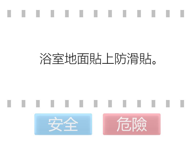 安全: 浴室地面貼上防滑貼。, 陽臺高度與欄杆設計符合安全規格。, 出遊前,檢查家中須關閉物品。如:關瓦斯。, 遇到家庭暴力時,馬上跟鄰居或師長求救。, 危險: 熱水器裝在不通風的室內。, 站在陽臺的板凳上看風景。, 在溼滑的浴室中玩水。, 觸摸盛裝熱食的容器。,