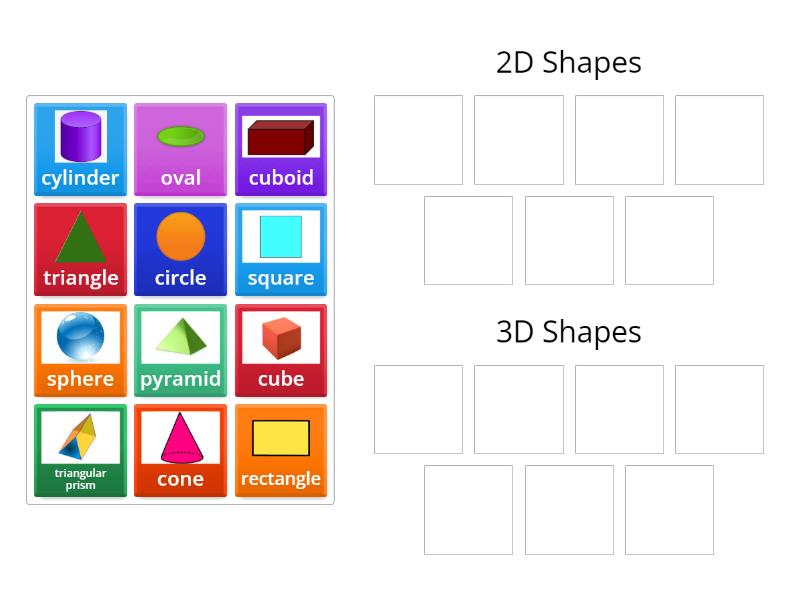 2D Shapes: rectangle, square, oval, triangle, circle, 3D Shapes: pyramid, cylinder, cuboid, cone, cube, triangular prism, sphere,