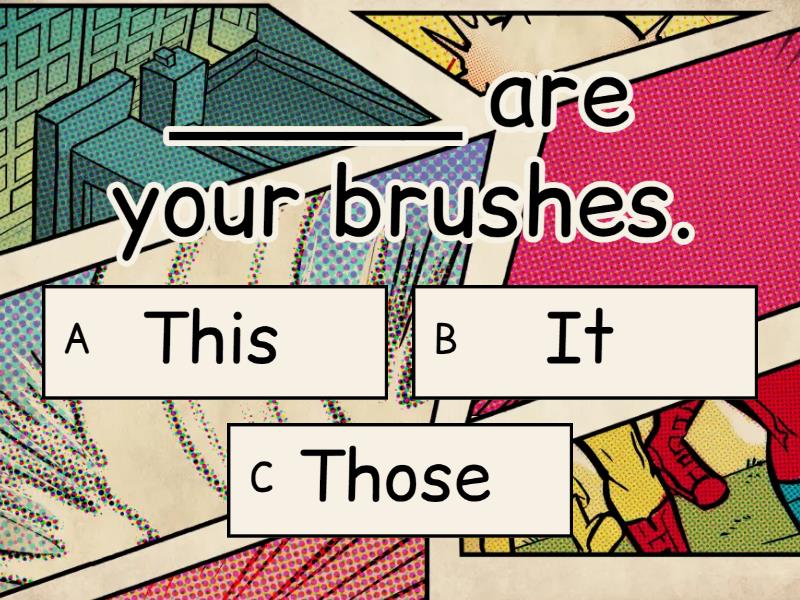1) This is _____. a) pen b) a pen c) pens 2) Those are my _____. a) a sheep b) sheep c) those sheeps 3) _____ is Paige's new book. a) That b) They c) These 4) _____ are your brushes. a) This b) It c) Those 5) A: What are those? B: _____ a) It is boxes. b) Those are box. c) They are boxes. 6) A: What is this? B: _____ a) This is watch. b) It's my watch. c) They're watch. 7) A: Is this your brother's cup? B: Yes, _____. a) this is her cup b) they're his cups c) it's his cup 8) A: Are those Abby's and Jenny's robots? B: No, _____. a) those aren't their robots b) they are not her robots c) it isn't our robot 9) A: Is it your cat? B: Yes, _____. a) they are my cats b) this is their cat c) it's our cat 10) A: _____ B: Yes, they are my son and my daughter. a) Is that your child? b) Are those your children? c) Are they your child?