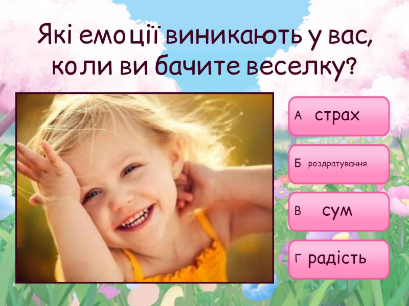 1) Коли ви можете побачити веселку? a) вночі під час дощу b) пізно ввечері під час дощу c) вранці під час дощу d) після дощу 2) Як ще можна назвати веселку? a) півколо на небі b) коло на небі c) райдуга d) дуга на небі 3) Скільки кольорів має веселка? a) 6 b) 4 c) 7 d) 5 4) Знайдіть правильну послідовність кольорів веселки. a) фіолетовий, жовтий, зелений, блакитний, червоний b) жовтий, блакитний, фіолетовий, зелений, синій c) червоний, помаранчевий, жовтий, зелений, блакитний d) блакитний, жовтий, фіолетовий, червоний, зелений 5) Які емоції виникають у вас, коли ви бачите веселку? a) сум b) радість c) роздратування d) страх 6) веселка виникає коли зустрічаються a) сонечко з хмаркою b) сонечко з дощиком c) сонечко з місяцем d) сонечко з вітром