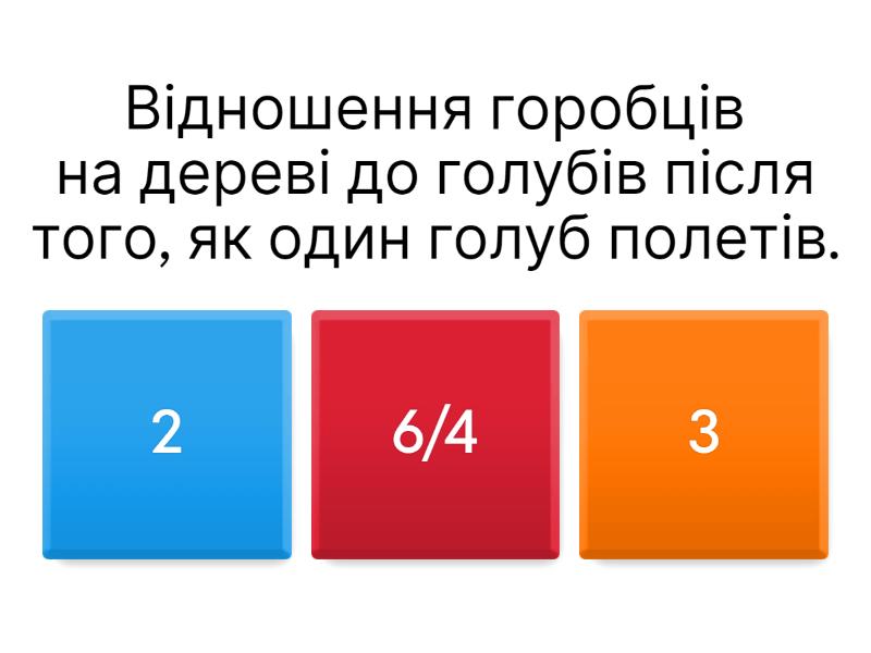 1) Відношення горобців на дереві до голубів після того, як один голуб полетів. a) 2 b) 6/4 c) 3 2) Відношення синиць до всіх птахів на дереві, коли прилетіли сороки. a) 3/15 b) 2/15 c) 2/14 3) Відношення сорок до горобців на дереві. a) 1/2 b) 2/1 c) 1/3 4) Яке відношення всіх горобців (на дереві та на землі) до всіх птахів? a) 11/26 b) 11/27 c) 11/28 5) Яке відношення голубів до сорок? a) 1 b) 2/3 c) 3/2 6) Як зміниться відношення всіх горобців до всіх птахів, якщо ще 2 горобці підлетять на дерево? a) 11/26 b) 11/28 c) 13/26