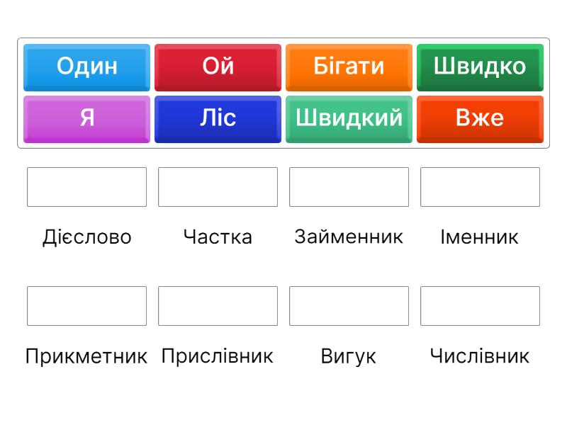 Ліс - Іменник, Бігати - Дієслово, Швидкий - Прикметник, Швидко - Прислівник, Один - Числівник, Я - Займенник, Вже - Частка, Ой - Вигук,