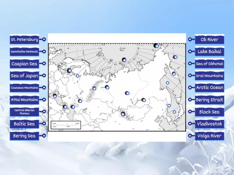Black Sea, Bering Strait, Caucasus Mountains, Caspian Sea, Volga River, Ural Mountains, Ob River, Baltic Sea, Lake Baikal, Central Siberian Plateau, Kamchatka Peninsula, Bering Sea, Attai Mountains, Arctic Ocean, Sea of Okhotsk, Sea of Japan, St. Petersburg, Vladivostok.