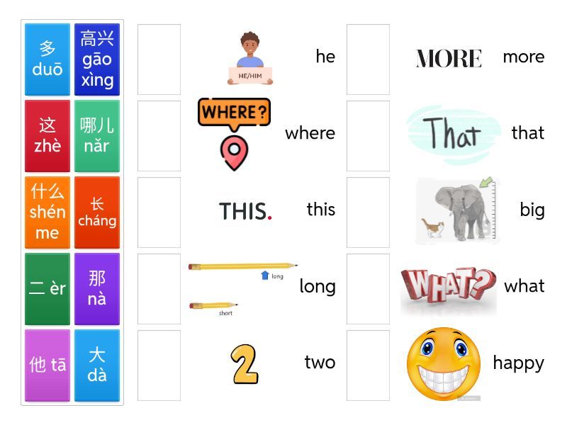好 hǎo - good, 多 duō - more, 大 dà - big, 小 xiǎo - small, 长 cháng - long, 高 gāo - high, 高兴 gāo xìng - happy, 我 wǒ - I, 你 nǐ - you, 他 tā - he, 她 tā - she, 我们 wǒ men - we, 这 zhè - this, 那 nà - that, 哪儿 nǎr - where, 谁 shuí - who, 什么 shén me - what, 几 jǐ - how much, 一 yī - one, 二 èr - two, 三 sān - three, 四 sì - four, 五 wǔ - five, 六 iù - six, 七 qī - seven, 八 bā - eight, 九 jiǔ - nine, 十 shí - ten,