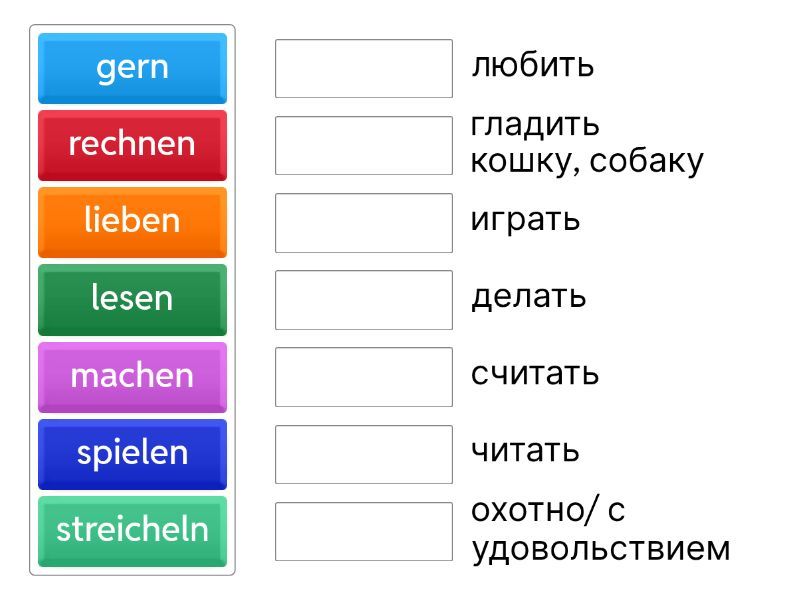 spielen - играть, heißen - называться, sein - быть, lieben - любить, hören - слушать/слышать, schwimmen - плавать, machen - делать, gern - охотно/ с удовольствием, dick - толстый, streicheln - гладить кошку, собаку, lesen - читать, rechnen - считать, malen - рисовать, schreiben - писать,