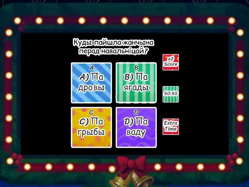 1) Куды пайшла жанчына перад навальніцай? a) A) Па дровы b) B) Па ягады c) C) Па грыбы d) D) Па ваду 2) Дзе жанчына схавалася ад навальніцы? a) У пячоры b) Пад бярозай c) У нары d) У старым доме 3) Што прынесла жанчына дадому? a) A) Залаты арэх b) B) Сасновыя шышкі c) C) Драўляную іголку d) D) Кветкі 4) Як назвалі дзяўчынку, якая нарадзілася з шышачкі? a) Віктарка b) Анэля c) Леона d) Марылька 5) Куды пайшла Анэля, каб выратаваць сваю маці? a) У глыбокую пячору b) На балота c) У лес d) На гару 6) Каго Анэля сустрэла ў лесе? a) Русалку b) Лесуна c) Гаюна d) Вадзяніка 7) Якое заданне дала Анэлі лясная істота? a) Сабраць тры залатыя арэхі b) Знайсці чарадзейную крыніцу c) Сабраць сасновыя шышкі d) Сплесці чарадзейны вяночак 8) Што сталася з маці Анэлі напрыканцы? a) Яна ператварылася ў дрэва b) Яна знікла бясследна c) Яна адужала d) Яна стала чараўніцай 9) Якая жывёлка дапамага Анэлі ў яе прыгодзе? a) b) c) d)