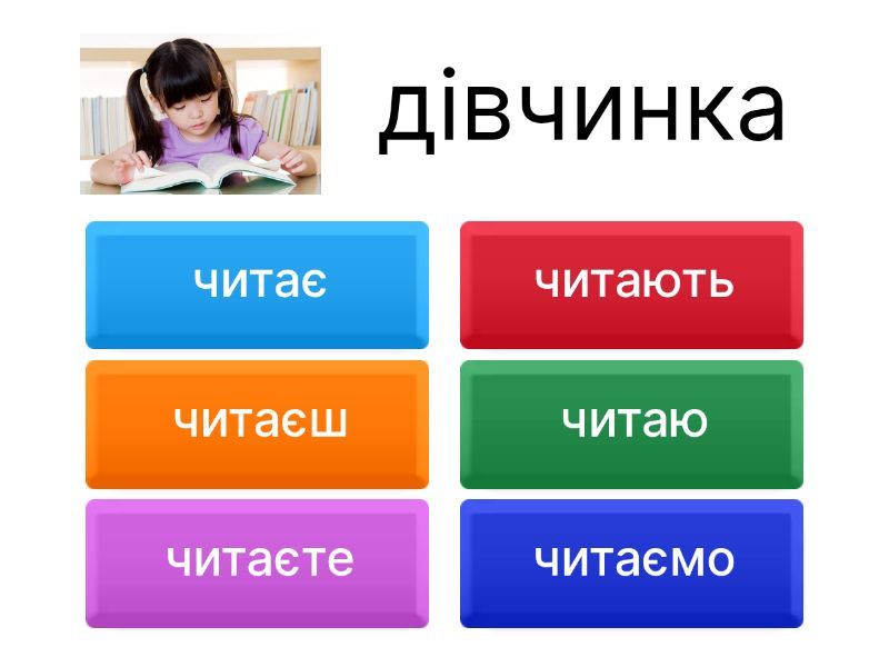 1) дівчинка a) читає b) читають c) читаєш d) читаю e) читаєте f) читаємо 2) хлопчик a) їм b) їсть c) їж d) їдять e) їсте f) їмо 3) дівчатка a) читаю b) читаєш c) читають d) читаємо e) читаєте f) читає 4) хлопчики a) читаешь b) читает c) читаете d) читають e) читаю f) читаємо 5) дівчатка a) сплю b) спиш c) спимо d) спите e) спить f) сплять 6) дівчинка a) сплю b) спиш c) спимо d) спите e) спить f) сплять 7) дівчинка a) біжить b) біжу c) біжиш d) біжимо e) біжите f) біжать 8) дівчатка a) біжу b) біжиш c) біжить d) біжать e) біжите f) біжимо 9) хлопчик a) ідеш b) іде c) іду d) ідете e) ідемо f) ідуть 10) хлопчики a) іду b) ідеш c) ідемо d) ідете e) іде f) ідуть 11) хлопчик a) п'ю b) п'єш c) п'ємо d) п'ють e) п'є f) п'єте 12) дівчатка a) п'ю b) п'ють c) п'єш d) п'єте e) п'ємо f) п'є
