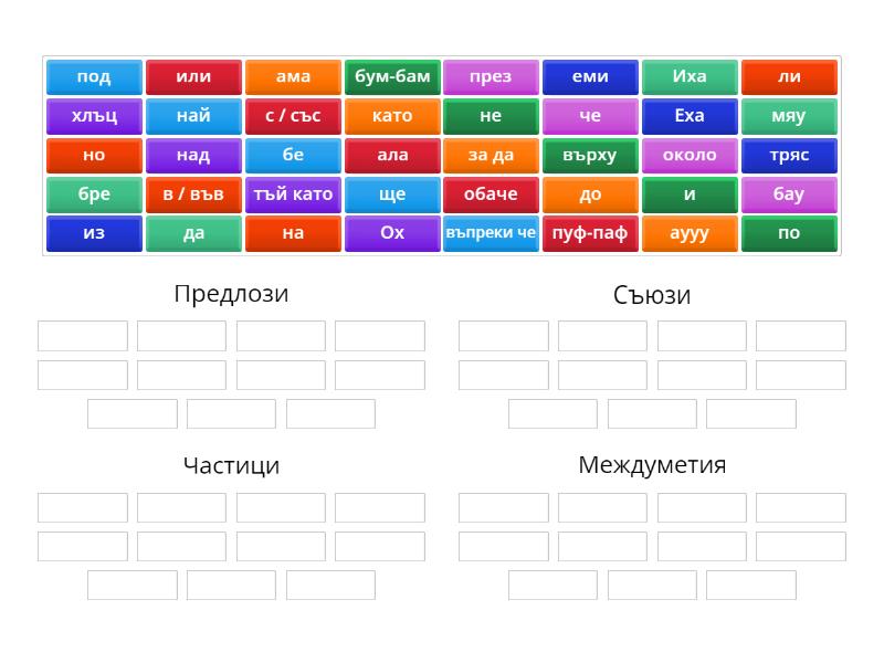 Предлози: на, над, в / във, под, до, около, върху, из, през, с / със, като, Съюзи: и, или, но, ала, ама, че, тъй като, за да, въпреки че, обаче, Частици: ще, по, най, да, не, еми, бе, бре, ли, Междуметия: Еха, Иха, Ох, бум-бам, пуф-паф, бау, аууу, мяу, тряс, хлъц,