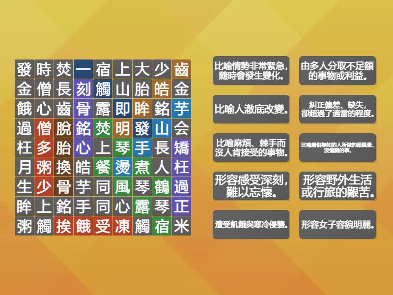 焚琴煮鶴 - 比喻庸俗無知的人所做的殺風景、 沒情調的事。, 刻骨銘心 - 形容感受深刻, 難以忘懷。, 僧多粥少 - 由多人分取不足額 的事物或利益。, 燙手山芋 - 比喻麻煩、棘手而 沒人肯接受的事物。, 脫胎換骨 - 比喻人澈底改變。, 一觸即發 - 比喻情勢非常緊急, 隨時會發生變化。, 明眸皓齒 - 形容女子容貌明麗。, 餐風露宿 - 形容野外生活 或行旅的艱苦。, 矯枉過正 - 糾正偏差、缺失, 卻超過了適當的程度。, 挨餓受凍 - 遭受飢餓與寒冷侵襲。,