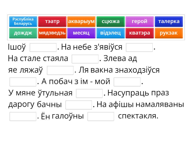 Ішоў ____. На небе з'явіўся ____. На стале стаяла ____. Злева ад яе ляжаў ____. Ля вакна знаходзіўся ____. А побач з ім - мой ____. У мяне ўтульная ____. Насупраць праз дарогу бачны ____. На афішы намаляваны ____. Ён галоўны ____ спектакля.