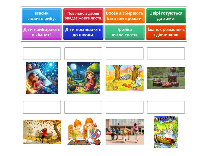 Діти прибирають в кімнаті., Івасик ловить рибу., Повільно з дерев опадає жовте листя., Діти поспішають до школи., Іринка лягла спати., Їжачок розмовляє з дівчинкою., Восени збирають багатий врожай., Звірі готуються до зими.,