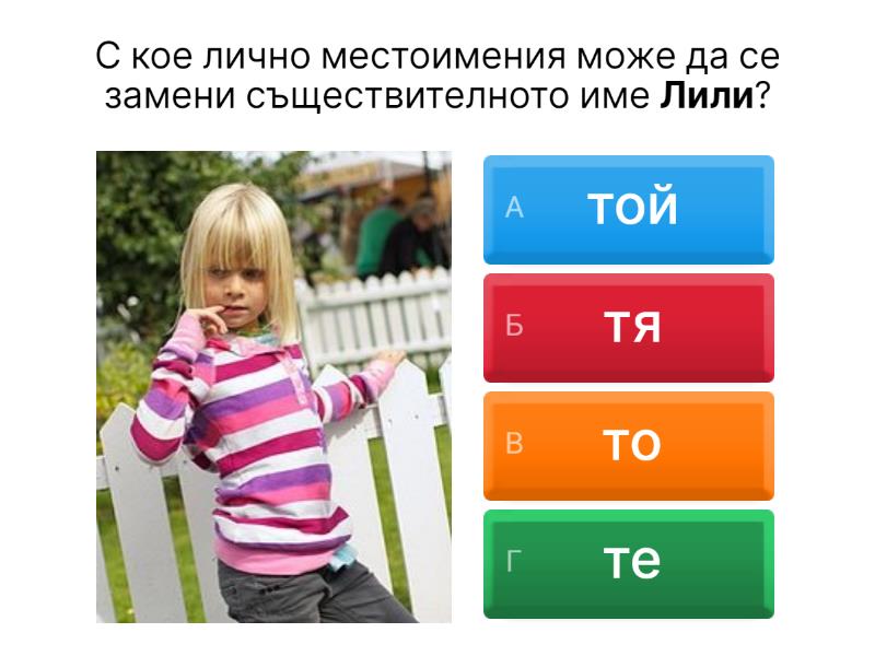 1) С кое лично местоимения може да се замени съществителното име Лили? a) той b) тя c) то d) те 2) С кое лично местоимения може да се замени съществителното име Стефан? a) той b) тя c) то d) ние 3) С кое лично местоимения може да се замени съществителното име дете? a) той b) тя c) то d) вие 4) С кое лично местоимения може да се замени съществителното име слънце? a) ние b) вие c) те d) то