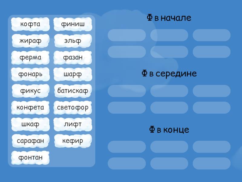 Ф в начале: фонтан, фонарь, фазан, фикус, ферма, финиш, Ф в середине: светофор, кофта, кефир, сарафан, конфета, лифт, Ф в конце: шкаф, жираф, шарф, эльф, батискаф,
