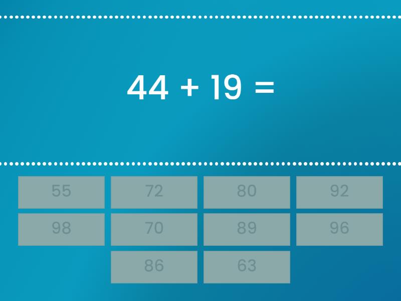 63 - 44 + 19 =, 96 - 51 + 45 =, 72 - 50 + 22 =, 80 - 66 + 14 =, 55 - 45 + 10 =, 89 - 79 + 10 =, 92 - 47 + 45 =, 70 - 18 + 52 =, 86 - 56 + 30 =, 98 - 53 + 45 =,
