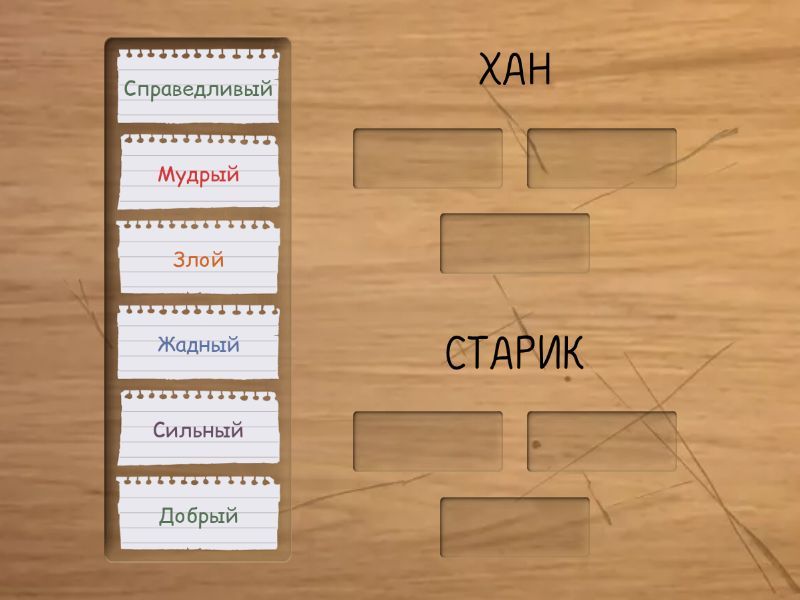 ХАН: Злой, Жадный, Сильный, СТАРИК: Мудрый, Добрый , Справедливый,