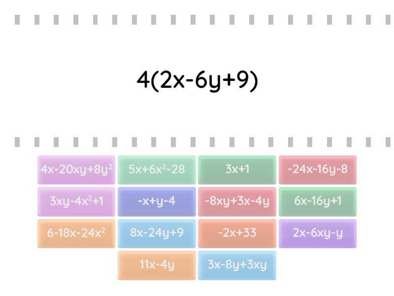 8x-24y+9 - 4(2x-6y+9), -24x-16y-8 - (-3x-2y-1)·8, 6-18x-24x2 - (1-3x-4x2)·6, 6x-16y+1 - 2(3x-8y+0,5), 4x-20xy+8y2 - (40x-200xy+80y2)·0,1, -x+y-4 - -1(x-y+4), 5x+6x2-28 - 5(x-2)+6(x2-3), -2x+33 - 7(x+6)-9(x+1), 2x-6xy-y - -2x+(-6xy+4x-y), 3x-8y+3xy - x-(-2x+8y-3xy), -8xy+3x-4y - -6xy-(2xy-3x+4y), 11x-4y - 9x+4y-(8y-2x), 3x+1 - -(3x+1)+(6x+2), 3xy-4x2+1 - (-12xy+16x2-4):(-4),