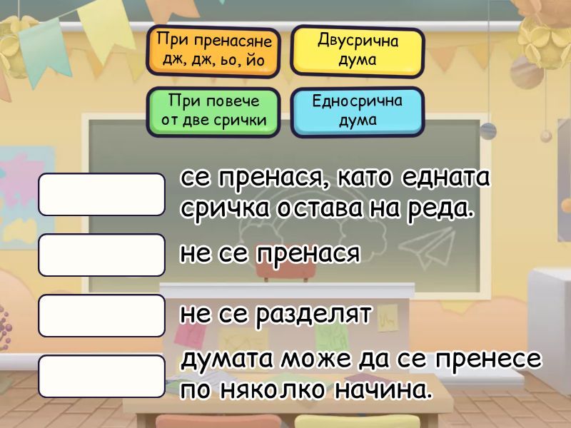 Едносрична дума - не се пренася , Двусрична дума - се пренася, като едната сричка остава на реда., При повече от две срички - думата може да се пренесе по няколко начина., При пренасяне дж, дж, ьо, йо - не се разделят,