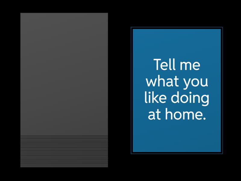 How old are you?, Where do you come from?, Where do you live? , What subject do you like best at school?, What clothes do you wear to school?, What do you eat after school? , Tell me something about the homework you have to do. , Who do you live with?, How many bedrooms are there in your house? , Where do you watch TV at home?, What's your favourite room in your house? , Tell me what you like doing at home. , What do you do in the mornings? , Do you get up early?, What do you normally eat for breakfast? , Do you live in a house or a flat?, How often do you see your friends? , Who do you see more, your friends or your family? , Who is your favourite teacher? , Do you always do your homework? , How often do you do sport?, What is your favourite sport? , Do you like doing sport inside or outside? , Where do you usually go on holiday? , What was your best holiday? Why? , Where do you want to live in the future? , What job do you want to do? , Will you live in your hometown in the future? , Do you have a hobby?, What is the most popular hobby in your family? .