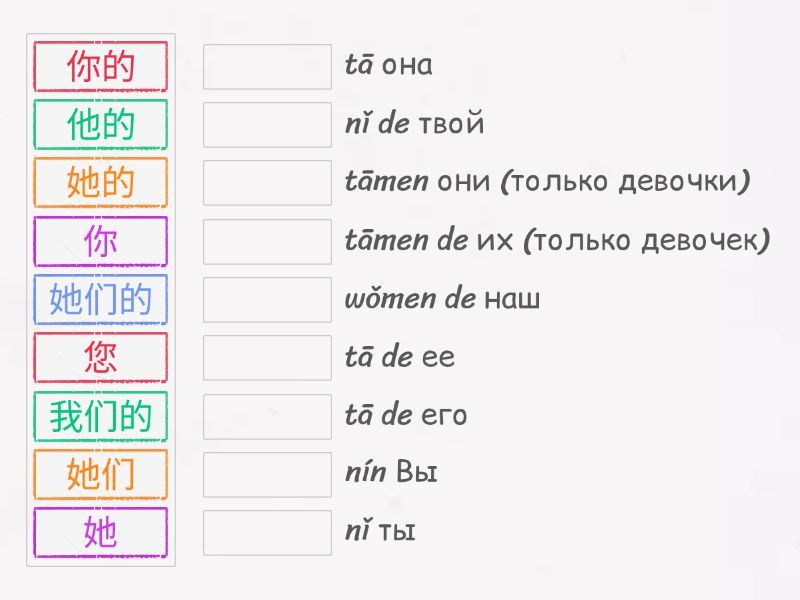 我 - wǒ я, 我的 - wǒ de мой, 我们 - wǒmen мы, 我们的 - wǒmen de наш, 你 - nǐ ты, 你的 - nǐ de твой, 你们 - nǐmen вы, 你们的 - nǐmen de ваш, 您 - nín Вы, 您的 - nín de Ваш, 他 - tā он, 他的 - tā de его, 她 - tā она, 她的 - tā de ее, 他们 - tāmen они, 他们的 - tāmen de их, 她们 - tāmen они (только девочки), 她们的 - tāmen de их (только девочек),