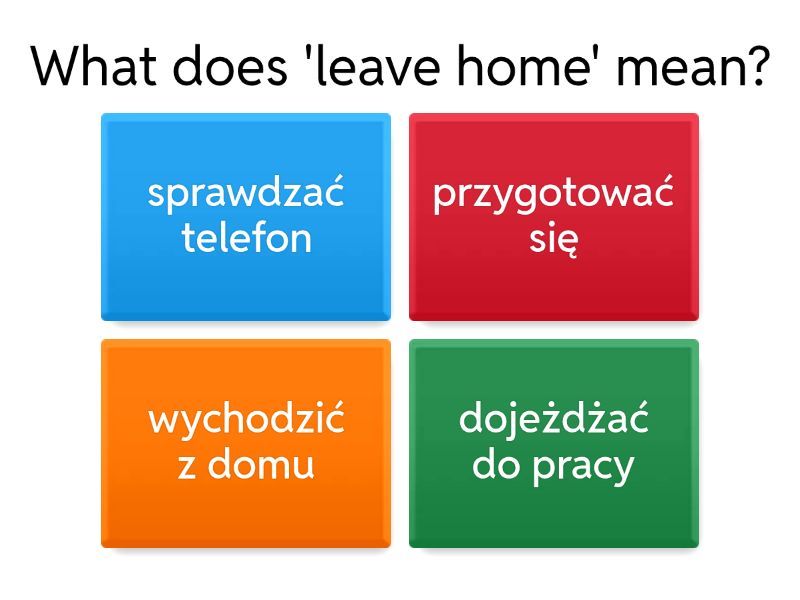 1) What does 'leave home' mean? a) sprawdzać telefon b) przygotować się c) wychodzić z domu d) dojeżdżać do pracy 2) How do you say 'get ready' in Polish? a) spóźniać się b) codzienna rutyna c) oszczędzać czas d) przygotować się 3) Translate 'check my schedule' to Polish. a) sprawdzać telefon b) sprawdzać plan dnia c) dojeżdżać do pracy d) zaczynać pracę 4) What is 'commute to work' in Polish? a) dojeżdżać do pracy b) jechać do pracy samochodem c) na czas d) w pośpiechu 5) How do you say 'start work' in Polish? a) poranne nawyki b) codzienna rutyna c) zaczynać pracę d) oszczędzać czas 6) What does 'on time' mean in Polish? a) spóźniać się b) na czas c) w pośpiechu d) oszczędzać czas 7) Translate 'in a hurry' to Polish. a) w pośpiechu b) na czas c) spóźniać się d) codzienna rutyna 8) What is 'running late' in Polish? a) w pośpiechu b) na czas c) spóźniać się d) oszczędzać czas 9) How do you say 'daily routine' in Polish? a) w pośpiechu b) poranne nawyki c) oszczędzać czas d) codzienna rutyna 10) Translate 'save time' to Polish. a) spóźniać się b) na czas c) w pośpiechu d) oszczędzać czas