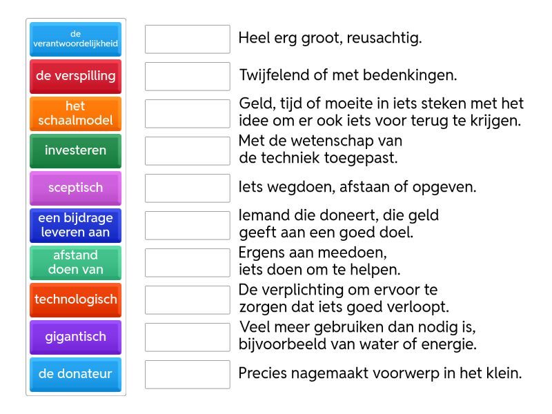 aan de orde stellen - Iets zeggen wat je belangrijk vindt om te bespreken., afstand doen van - Iets wegdoen, afstaan of opgeven., belasting heffen - Verplicht laten betalen. Dat doet de regering. Het geld dat binnenkomt wordt gebruikt voor bijvoorbeeld wegen of scholen., een bijdrage leveren aan - Ergens aan meedoen, iets doen om te helpen., consuminderen - Minder kopen en minder verbruiken., investeren - Geld, tijd of moeite in iets steken met het idee om er ook iets voor terug te krijgen., minimaliseren - Verkleinen, zoveel mogelijk verminderen., de activist - Persoon die actie voert om zijn doel te bereiken., de donateur - Iemand die doneert, die geld geeft aan een goed doel., de installatie - Bij elkaar horende technische of elektrische apparaten., het schaalmodel - Precies nagemaakt voorwerp in het klein., de verantwoordelijkheid - De verplichting om ervoor te zorgen dat iets goed verloopt., de verspilling - Veel meer gebruiken dan nodig is, bijvoorbeeld van water of energie., baanbrekend - Grensverleggend, vernieuwend. Gezegd van iets wat nieuwe mogelijkheden biedt., duurzaam - Langdurig goed en niet slecht voor het milieu., efficiënt - Doelmatig. Snel en handig met zoveel mogelijk resultaat., gigantisch - Heel erg groot, reusachtig., sceptisch - Twijfelend of met bedenkingen., technologisch - Met de wetenschap van de techniek toegepast., verpakkingsvrij - Zonder verpakking.,