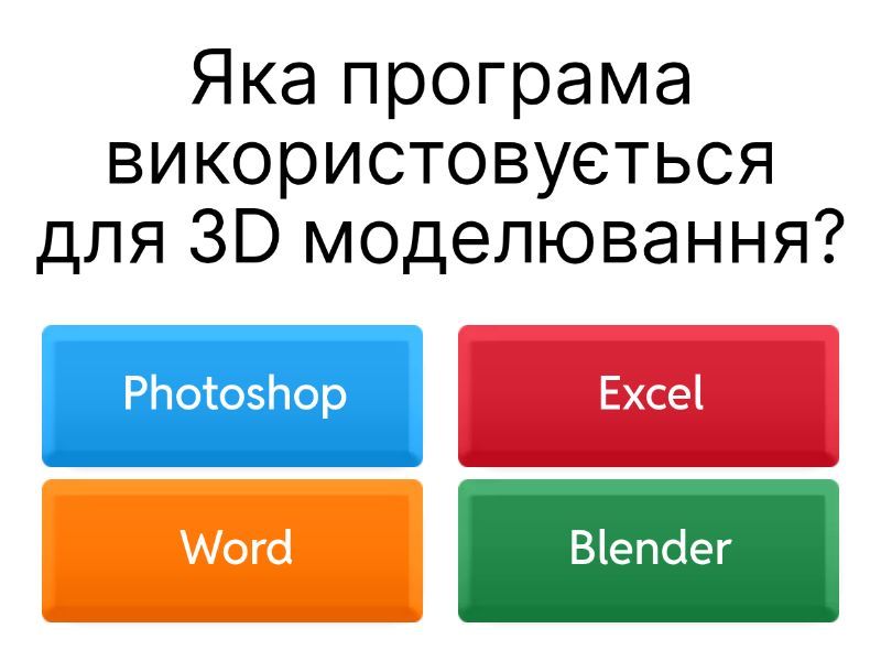 1) Яка програма використовується для 3D моделювання? a) Photoshop b) Excel c) Word d) Blender 2) Який формат файлу для 3D моделей у Blender? a) .pdf b) .blend c) .jpg d) .docx 3) Що таке mesh у 3D моделюванні? a) Сітка b) Світло c) Текстура d) Камера 4) Яка клавіша для переміщення об'єктів у Blender? a) T b) G c) R d) S 5) Яка клавіша для обертання об'єктів у Blender? a) S b) E c) G d) R 6) Яка клавіша для масштабування об'єктів у Blender? a) T b) S c) G d) R 7) Яка клавіша для виділення всіх об'єктів у Blender? a) C b) D c) A d) B 8) Яка клавіша для відміни дії у Blender? a) Ctrl+X b) Ctrl+Z c) Ctrl+C d) Ctrl+Y 9) Яка клавіша для збереження файлу у Blender? a) Ctrl+S b) Ctrl+O c) Ctrl+N d) Ctrl+P 10) Яка клавіша для створення нового об'єкта у Blender? a) Shift+D b) Shift+F c) Shift+A d) Shift+S 11) Яка клавіша для рендерингу сцени у Blender? a) F12 b) F10 c) F9 d) F11 12) Яка клавіша для переходу в режим редагування у Blender? a) Shift b) Tab c) Alt d) Ctrl
