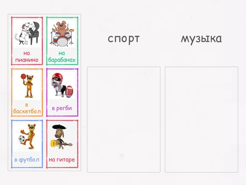 спорт: в футбол, в баскетбол, в регби, музыка: на гитаре, на барабанах, на пианино,