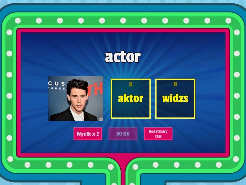 1) actor a) aktor b) widzs 2) painter a) rzeźbiarz b) malarz 3) fizyk a) physicist b) mathematician 4) królowa a) queen b) king 5) piosenkarz / piosenkarka a) singer b) actor 6) pisarz / pisarka a) reader b) writer 7) audiowycieczka a) journey b) audio tour 8) zamek a) castle b) road 9) ceremonia a) ceremony b) epiphany 10) podekscytowany a) excited b) irritating 11) przeżycie / doświadczenie a) experience b) memory 12) goryl a) gorilla b) elephant 13) cesarzowa a) empress b) king 14) monarcha a) monarch b) elephant 15) pingwin a) penguin b) whale 16) słoneczny a) sunny b) sailor 17) pogoda a) weather b) sky 18) podziwiać a) admire b) steal 19) nagroda a) award b) dance 20) kariera a) career b) street 21) śmierć a) death b) duck 22) geniusz a) genius b) teacher 23) hit / przebój a) hit b) fail 24) główny (np. wokalista) a) lead b) play 25) wykładowca a) lecturer b) student 26) ruch / krok a) move b) moving 27) wykonawca a) performer b) chess player 28) producent a) producer b) king 29) płyta a) record b) acerd 30) singiel a) single  b) tungle 31) solista a) solo artist b) actor 32) zwycięzca a) winner b) king