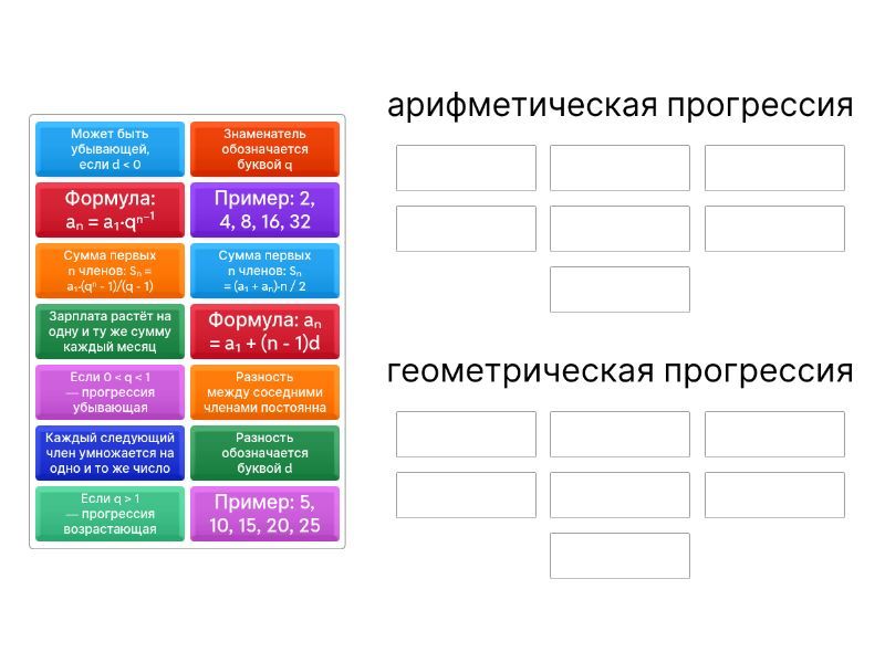 арифметическая прогрессия : Пример: 5, 10, 15, 20, 25, Формула: aₙ = a₁ + (n - 1)d, Разность обозначается буквой d, Разность между соседними членами постоянна, Сумма первых n членов: Sₙ = (a₁ + aₙ)·n / 2, Зарплата растёт на одну и ту же сумму каждый месяц, Может быть убывающей, если d < 0, геометрическая прогрессия : Пример: 2, 4, 8, 16, 32, Знаменатель обозначается буквой q, Формула: aₙ = a₁·qⁿ⁻¹, Если q > 1 — прогрессия возрастающая, Сумма первых n членов: Sₙ = a₁·(qⁿ - 1)/(q - 1), Каждый следующий член умножается на одно и то же число, Если 0 < q < 1 — прогрессия убывающая,
