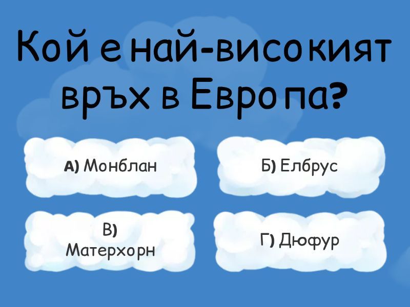1) Кой е най-високият връх в Европа? a) A) Монблан b) Б) Елбрус c) В) Матерхорн d) Г) Дюфур 2) Коя е най-голямата европейска низина? a) A) Източноевропейска низина b) Б) Среднодунавска низина c) В) Паданска низина d) Г) Тесалийска низина 3) Коя планина образува естествена граница между Европа и Азия? a) A) Карпатите b) Б) Алпите c) В) Урал d) Г) Пиренеите 4) Коя планинска верига е младонагъната и със силно изразени алпийски форми? a) A) Урал b) Б) Стара планина c) В) Карпати d) Г) Алпи 5) Кой регион в Европа е известен с обширни карстови форми? a) A) Скандинавия b) Б) Динарски планини c) В) Британски острови d) Г) Фландърска низина 6) Кои са основните релефни форми на Балканския полуостров? a) A) Обширни високопланински плата b) Б) Дълбоки каньони и вулкани c) В) Комбинация от високи планини и обширни котловини d) Г) Гигантски ледникови полета 7) Кои планини са формирани главно под влияние на ледникова дейност? a) A) Карпатите b) Б) Скандинавските планини c) В) Пиренеите d) Г) Апенините 8) Коя е най-голямата низинна област в Северна Европа? a) A) Белгийска низина b) Б) Среднодунавска низина c) В) Московска низина d) Г) Северноевропейска низина 9) Коя планинска верига образува естествената граница между Франция и Испания? a) A) Алпи b) Б) Пиренеи  c) В) Карпати d) Г) Урал 10) Кой е най-големият полуостров в Европа? a) A) Пиренейски b) Б) Балкански c) В) Скандинавски d) Г) Апенински
